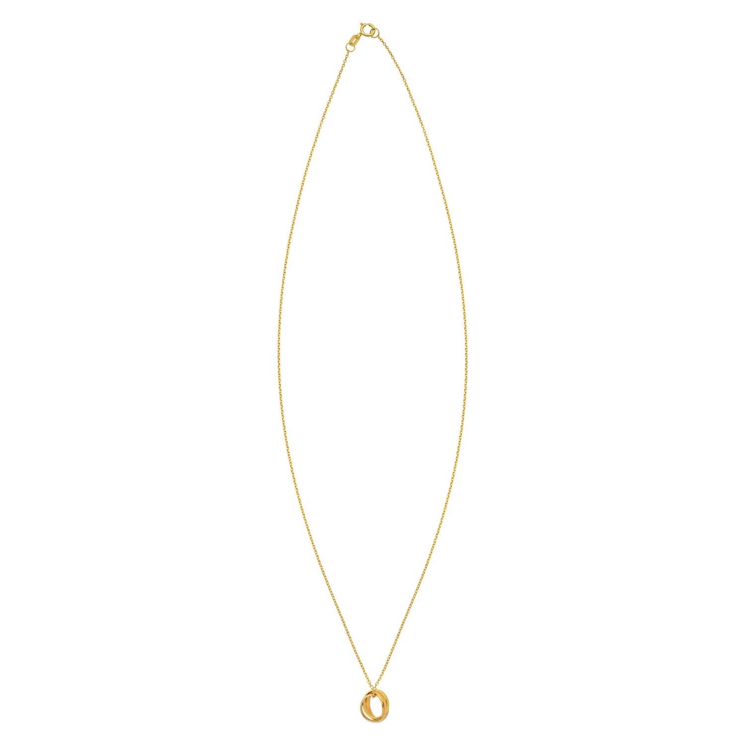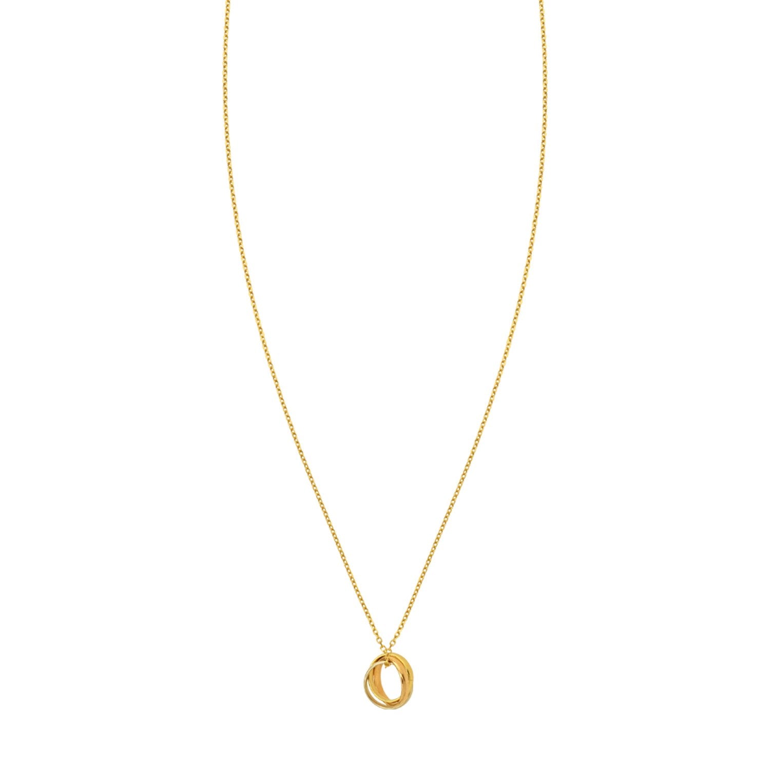 This 18 inches necklace features interlocking polished trinity elements crafted from 14K tri-color gold, symbolizing unity and harmony. Secured with a spring ring clasp, it offers both elegance and versatility, making it a timeless addition to any jewelry collection.